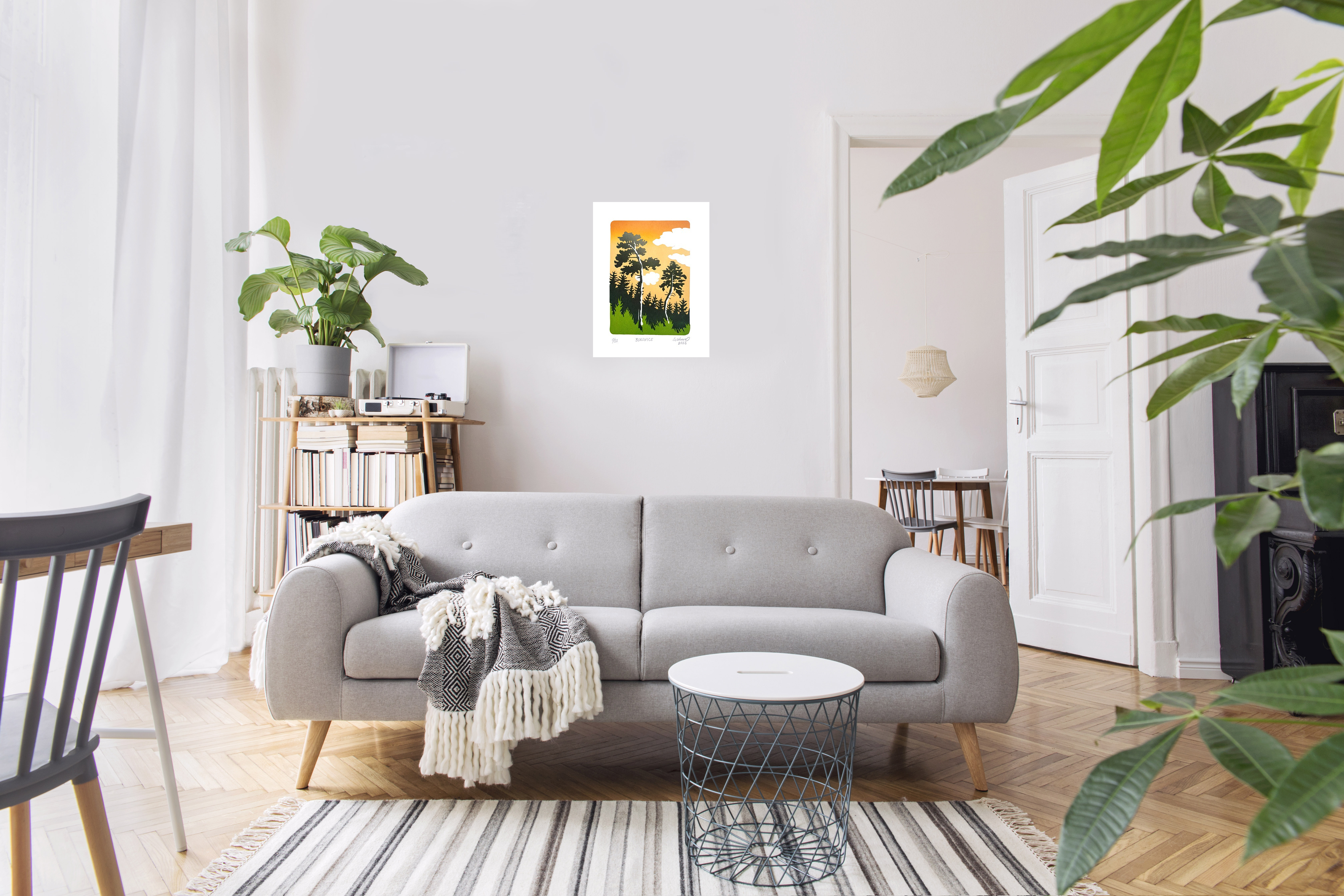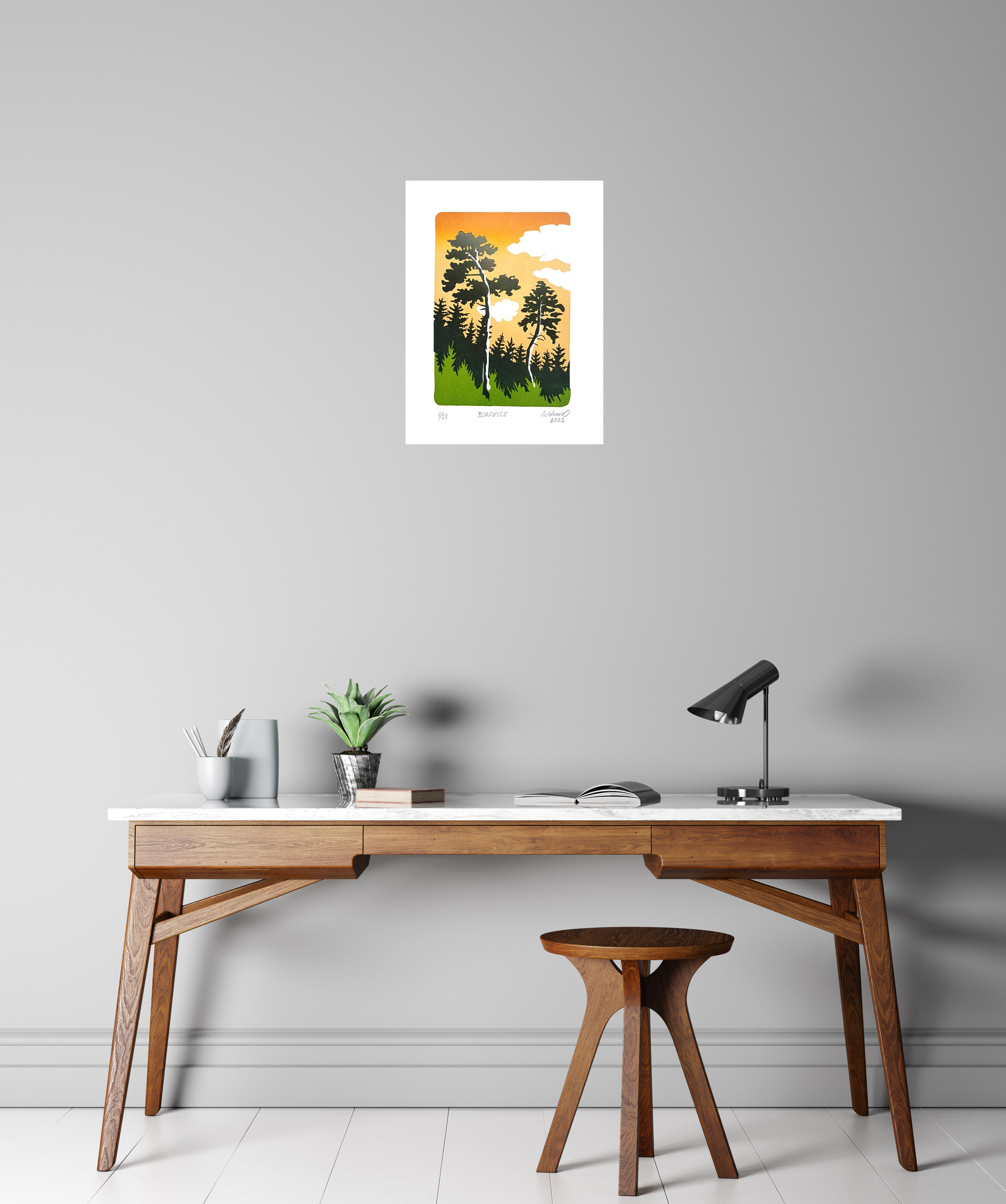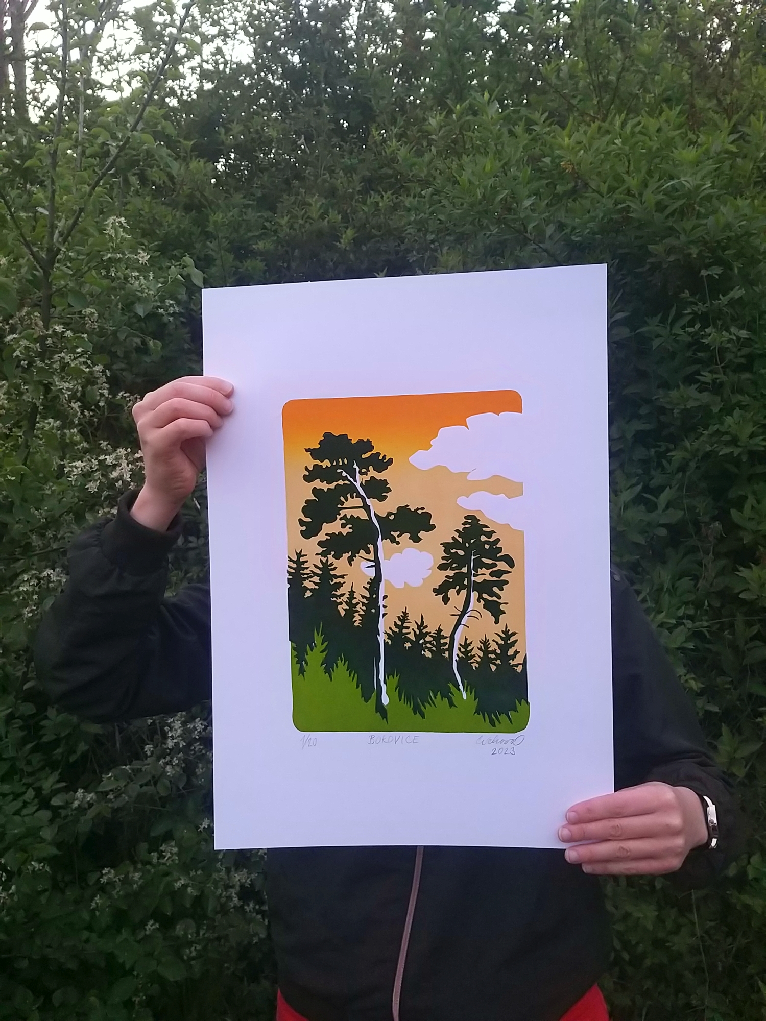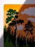V přírodě je krásně a tak jsem si na tomto linorytu pohrála s pár borovicemi. V lese je nádherný klid, jaký ve městě nenajdu. Jedná se o soutisk 3 barevných vrstev. První vrstva tvořící pozadí je tištěna s přechodem (iris) k dodání hloubky. Jemné naoranžovělé smrákání nad tichým hájem. D. C.