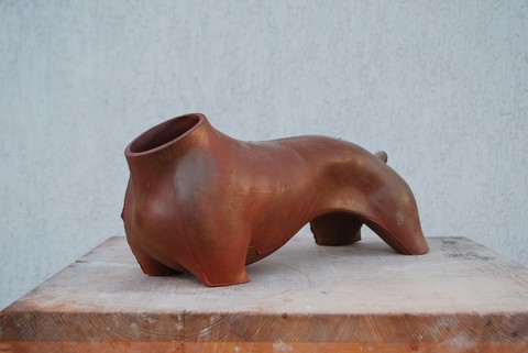 Cílem mé práce jsou emoce a zážitek, který chci u diváka vyvolat. Zdrojem emocí je forma, kterou vědomě komponuji za použití klasických sochařských metod. Torzo jsem oprostil od detailu, nechal vyniknout velké formy a jako kontrast k velkým hladkým formám ponechávám odlitek v surovém stavu s dělícími rovinami, které jsou stopou po výrobě. Důležitou roli sehrává síla střepu a korespondence vnitřního prostoru torza s vnějším prostorem, který socha ovládá. A. V.